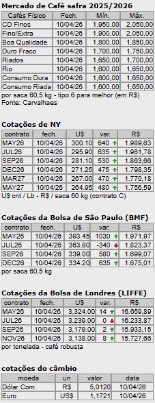 Os contratos de arábica para maio próximo na ICE Futures US, romperam a barreira dos três dólares por libra peso, oscilaram 945 pontos entre a máxima e a mínima, batendo, na máxima do dia, em US$ 3,0125 por libra peso, em alta de 755 pontos. Encerraram a sexta-feira (10) valendo US$ 3,0010 por libra peso, com ganhos de 640 pontos (2,18%). Na ICE Europe, os contratos de robusta para maio próximo, bateram, sexta-feira (10), na máxima do dia, em 3.330 dólares por tonelada, em alta de 20 dólares. Fecharam o pregão a 3.324 dólares, em alta de 14 dólares (0,43%).