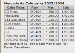 Sexta-feira (20), na ICE Futures US, os contratos de arábica para maio próximo bateram em US$ 2,4770 por libra peso na máxima do dia, oscilaram 955 pontos entre a máxima e a mínima, e fecharam o pregão a US$ 2,4140 por libra peso, em alta de 155 pontos. Na ICE Europe, em Londres, os contratos de robusta para maio fecharam na sexta (19) valendo US$ 4.083, em alta de 2 dólares.