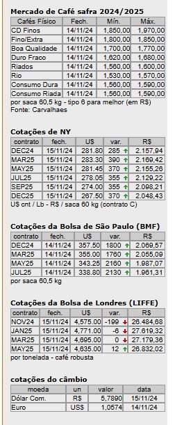 Na quinta-feira (14), os contratos de arábica para março próximo na ICE Futures US, oscilaram 1.450 pontos entre a máxima e a mínima, romperam os US$ 2,80, batendo na máxima do dia em US$ 2,8495 por libra peso, em alta de 1.375 pontos. Fecharam o pregão valendo US$ 2,7895 por libra peso, em alta de 730 pontos.
