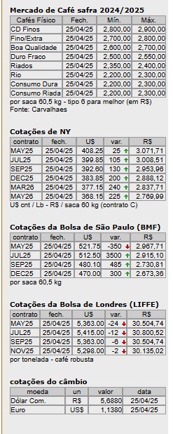 A bolsa de Nova Iorque – ICE, do fechamento do dia 17, quinta-feira, até o fechamento do dia 25, subiu nos contratos para entrega em julho próximo 2.725 pontos ou US$ 36,05 (R$ 205,03) por saca. Em reais, as cotações para entrega em julho próximo na ICE, fecharam no dia 17 a R$ 2.860,65 por saca, e sexta-feira (25), a R$ 3.008,51. Ainda na última sexta-feira, nos contratos para entrega em julho, a bolsa de Nova Iorque fechou em alta de 105 pontos.
