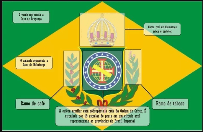 Parafraseando a escritora belga, Marguerite Yourcenar, ao observar que “cada época escolhe o seu passado”. Podemos dizer que cada regime escolhe o seu passado. Houve um tempo em que as cores da bandeira eram associadas ao verde das matas e, o amarelo, ao do muito ouro encontrado no Brasil. Até hoje, muitas pessoas consideram como legítimos esses significados dados à bandeira. No entanto, o verde e o amarelo representam a união de D. Pedro I com a Imperatriz Leopoldina. O verde é uma homenagem à Casa de Bragança e, consequentemente, à família de Dom Pedro I. Vale frisar que o verde tem o mesmo tom da bandeira de Portugal. Já o amarelo-ouro faz referência à Dinastia Habsburgo-Lorena, à qual pertencia a imperatriz. A Casa dos Habsburgos, também conhecida como Casa da Áustria, foi uma das mais influentes na Europa entre os séculos XIII e XX.