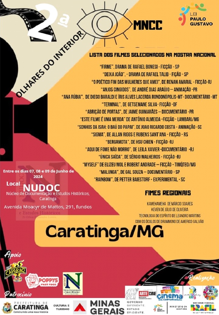 CARATINGA- O Coletivo Arte Cine anuncia os curtas-metragens selecionados para a aguardada 2ª Mostra Nacional de Cinema de Caratinga (MNCC). Idealizada e proposta por Rosângela Lopes Protásio, a mostra será realizada às 19h, dos dias 7, 8 e 9 de junho; no NUDOC – Núcleo de Documentação e Estudos Históricos, localizado na Av. Moacyr de Mattos, 291, fundos, Centro, Caratinga.