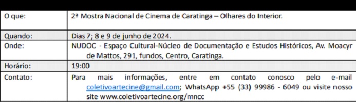 CARATINGA- O Coletivo Arte Cine anuncia os curtas-metragens selecionados para a aguardada 2ª Mostra Nacional de Cinema de Caratinga (MNCC). Idealizada e proposta por Rosângela Lopes Protásio, a mostra será realizada às 19h, dos dias 7, 8 e 9 de junho; no NUDOC – Núcleo de Documentação e Estudos Históricos, localizado na Av. Moacyr de Mattos, 291, fundos, Centro, Caratinga.