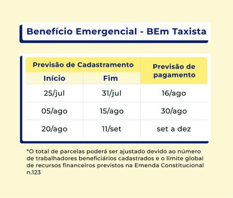 A previsão é pagar até seis parcelas de até R$ 1 mil cada, observados a quantidade de taxistas elegíveis e o limite global disponível para o pagamento do auxílio. O primeiro pagamento será em 16 de agosto e deverá contemplar duas parcelas, referentes aos meses de julho e agosto. Já o pagamento dos taxistas incluídos na segunda etapa está previsto para o dia 30 de agosto.
