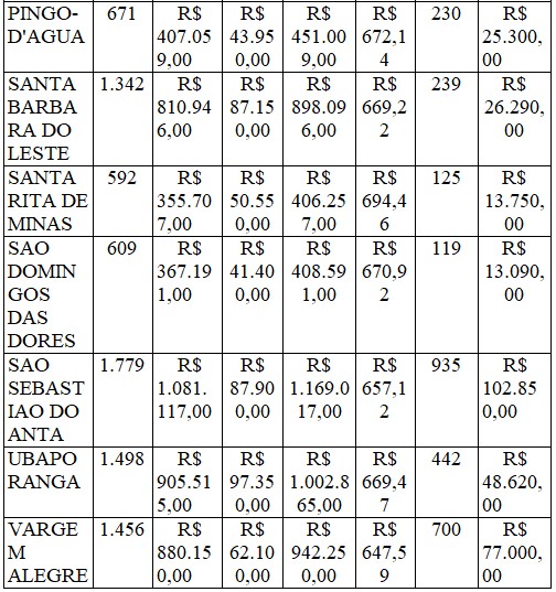 Confira na tabela os valores para os municípios da região.
