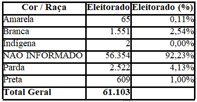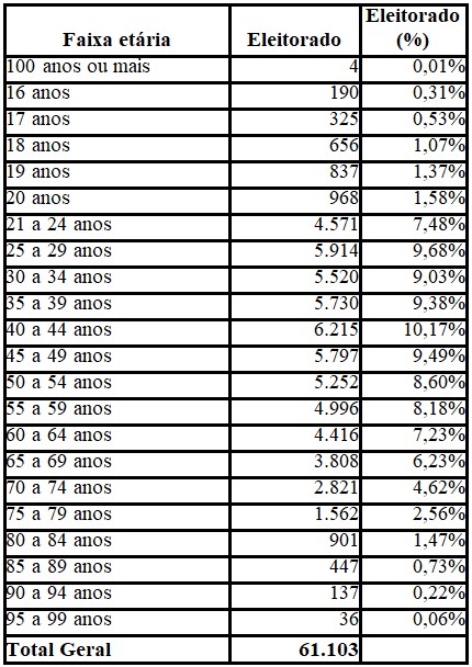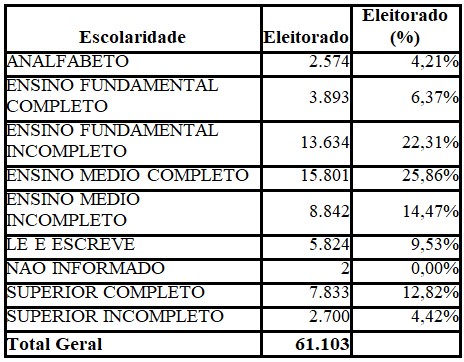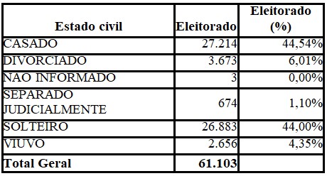 Do total, 55.340 (90,57%) já estão com biometria e 5.763 (9,43%) sem biometria. São 32.279 mulheres e 28.822 homens. Os números ainda apresentam 27.214 casados e 26.883 solteiros. Por grau de instrução, a maioria possui Ensino Médio Completo.