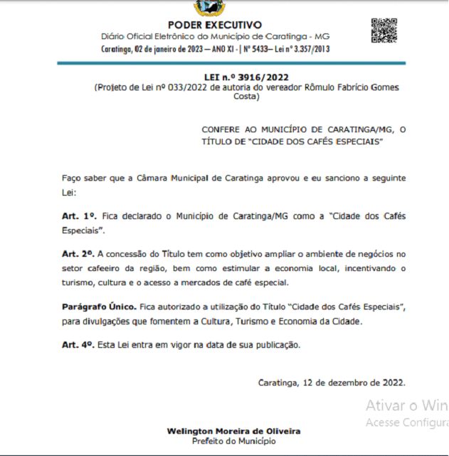 O prefeito assinou a lei nº 3916/2022, que confere ao município de Caratinga, o título de ‘Cidade dos Cafés Especiais’. O projeto de lei nº 033/2022 de autoria do vereador Rominho Costa (PV).