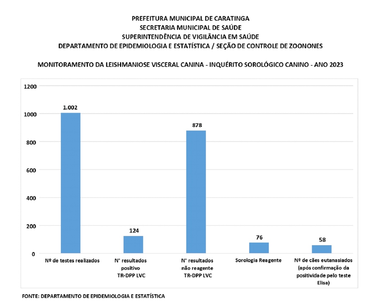 No ano de 2023, até o momento, foram 1.002 testes realizados, sendo 124 com resultados positivos no teste rápido e 878 resultados não reagentes. Posteriormente, 76 casos foram confirmados através da sorologia e 58 animais precisaram ser eutanasiados. No caso daqueles que possuem tutor, o Departamento frisa que houve autorização dos tutores para eutanásia. Em outros casos, os tutores optaram pela tentativa de tratamento.
