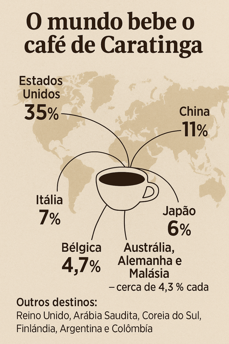Caratinga tem como principal destino das exportações de café os Estados Unidos, que respondem por 35% dos embarques, seguidos por China (11%), Itália (7%) e Japão (6%). “É histórico, não só para Caratinga, mas para o Brasil. Esses países são os maiores importadores do nosso café e continuam demandando muito neste ano. A procura tem sido intensa, especialmente pelo café da nossa região”, comenta Rodrigo.