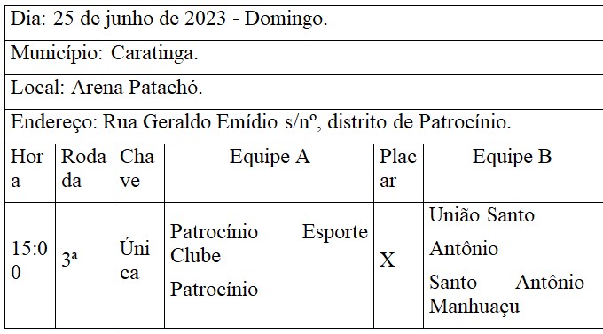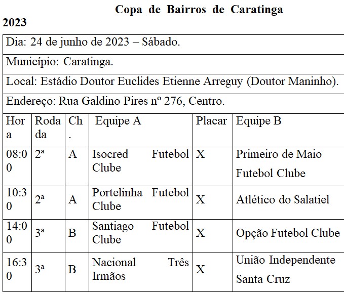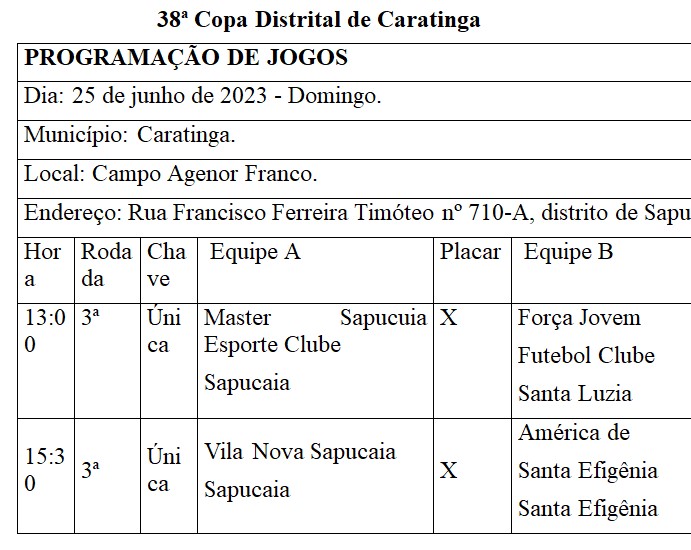 No futebol, acontecerá no sábado (24) uma rodada especial da Copa de Bairros com quatro partidas acontecendo no Estádio Doutor Maninho (Clube Caratinga) às 8h, 10h30min, 14h e 16h30. Já no domingo (25), a tradicional Copa Distrital terá rodada dupla em Sapucaia e uma partida no distrito de Patrocínio.
