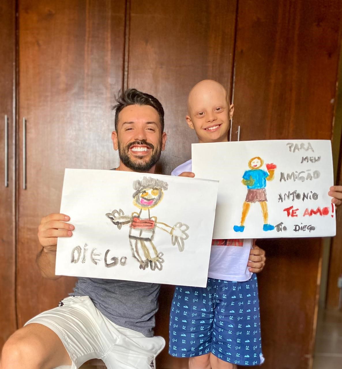 Juntos, Antônio e Diego fazem as mais diversas atividades e se divertem. Com o Novo Coronavírus foi preciso se adaptar, mas, a amizade permaneceu forte. “Hoje em dia com essa pandemia tenho vindo menos vê-lo, até tomar um certo cuidado para vir. Mas, fazemos chamada de vídeo direto, até para assistir desenho, ele assiste minhas aulas de personal, treina junto comigo. Tentamos nos aproximar, mesmo distantes e quando eu consigo vir, que a situação está um pouco mais fácil, fico um pouco com ele. Pintamos, tocamos instrumento, brincando de bola, fazemos vídeo no Instagram”.