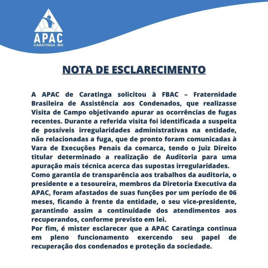 A Apac também se manifestou sobre o assunto através de nota enviada à imprensa, dizendo que “solicitou à FBAC (Fraternidade Brasileira de Assistência aos Condenados) que realizasse visita de campo objetivando apurar as ocorrências de fugas recentes. Durante a referida visita foi identificada a suspeita de possíveis irregularidades administrativas na entidade, não relacionadas a fuga, que de pronto foram comunicadas à Vara de Execuções Penais da comarca, tem o juiz de direito titular determinado a realização de auditoria para uma apuração mais técnica acerca das supostas irregularidades. Como garantia de transparência aos trabalhos da auditoria, o presidente e a tesoureira, membros da diretoria executiva da Apac, foram afastados de suas funções por um período de seis meses, ficando à frente da entidade, o seu vice-presidente, garantindo assim a continuidade dos atendimentos aos recuperandos, conforme previsto em lei.