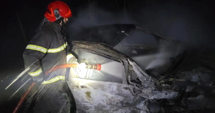 O veículo pegou fogo após se envolver em uma colisão, sair da pista e cair em um talude de cinco metros.