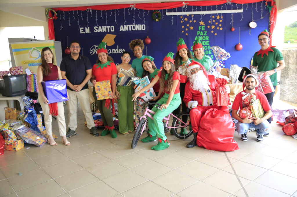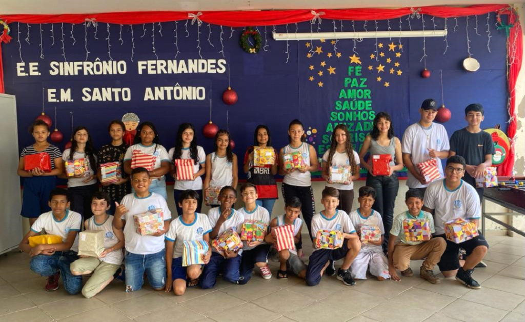 Nesse ano de 2022 foram atendidas duas escolas públicas do Bairro Santo Antônio: Escola Municipal Santo Antônio, 1º ao 5º ano com o total de 310 crianças atendidas com brinquedos e Escola Estadual Sinfrônio Fernandes, 6º ao 9º ano com 392 crianças atendidas com kit panetone + caixa de bombom.