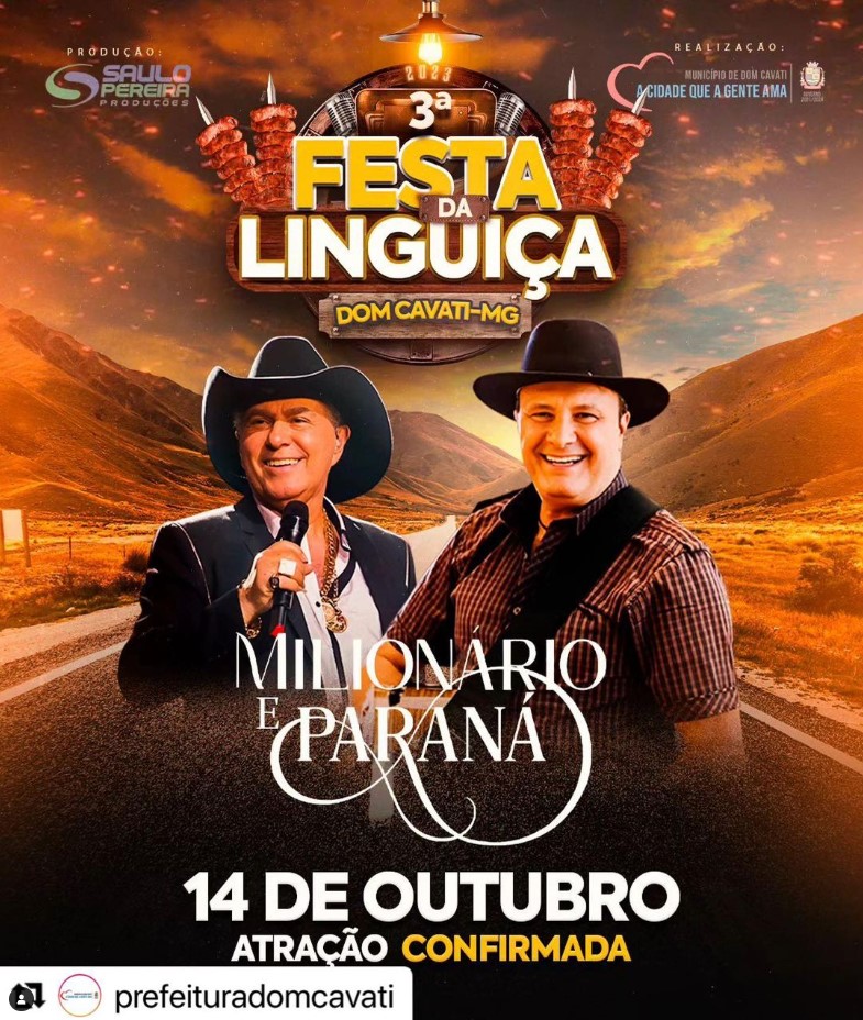 E a primeira atração da nossa 3° Festa da Linguiça está CONFIRMADA. É com muita alegria que anunciamos pra vocês que @milionario.oficial (ex Milionário & José Rico) e @paranaoficial (ex Chico Rey & Paraná) estarão abrilhatando a nossa festa cantando os grandes sucessos das duas duplas.