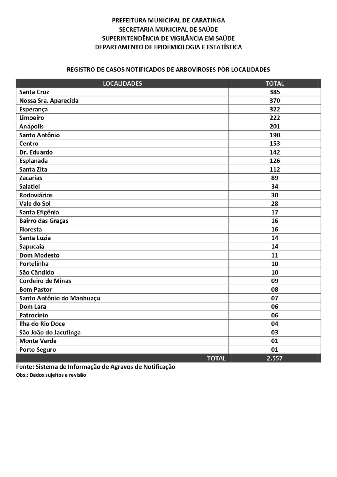 CARATINGA- O Bairro Santa Cruz concentra, até o momento, o maior número de casos notificados de arboviroses (doenças provocadas pelo mosquito Aedes aegypti). Os dados foram divulgados pelo Departamento de Epidemiologia e Estatística.