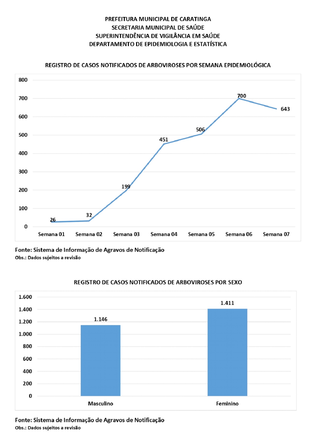 Ao todo foram notificados 2.557 casos, considerando sede e distritos, conforme nova atualização, sendo 1.411 mulheres e 1.146 homens. Apesar do grande número de casos notificados, observa-se pela primeira vez a queda do número de notificações desde a primeira semana epidemiológica.