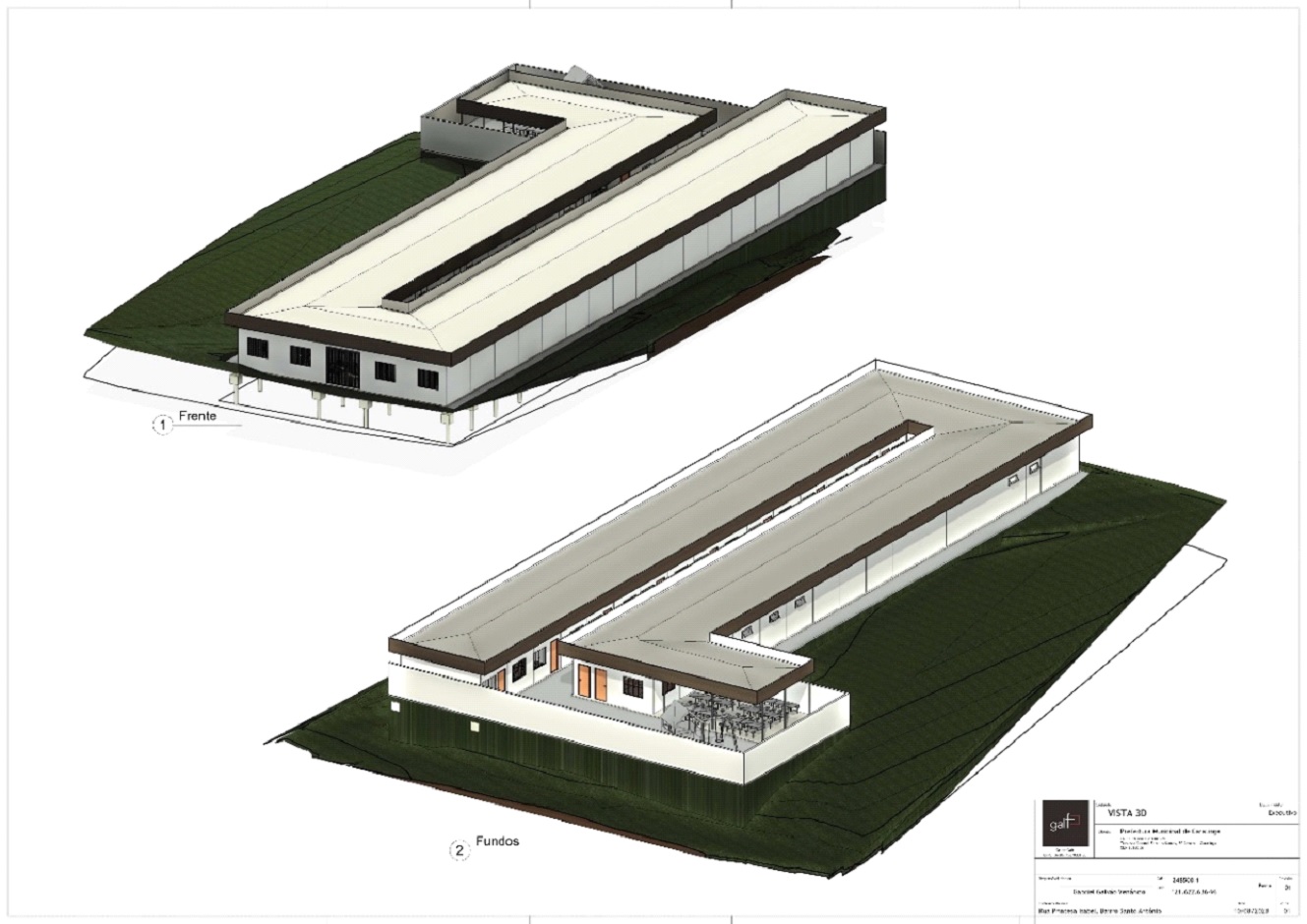 O pavimento térreo juntamente com uma parte coberta e outra parte aberta, possui uma quadra poliesportiva. O imóvel será composto pelos seguintes espaços: recepção/hall de entrada; secretaria; coordenação; diretoria; circulação; sala dos professores; lavabos dos professores; biblioteca/informática; um sanitário coletivo masculino com seis bacias sanitárias; um sanitário coletivo feminino com seis bacias sanitárias; dois sanitários PCD; cozinha; área de serviço; refeitório e 10 salas de aula.
