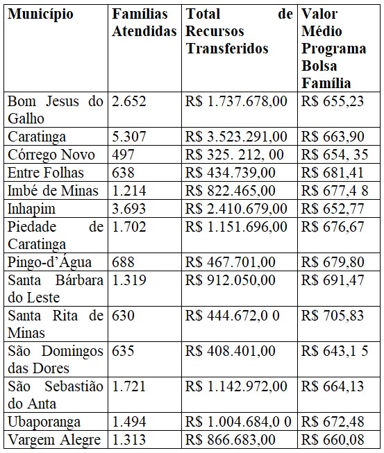 Conforme dados do Ministério do Desenvolvimento Social, Caratinga tem neste mês de julho 5.307 beneficiários, sendo o total de recursos recebidos de R$ 3.523.291,00 e valor médio de R$ 663,90.