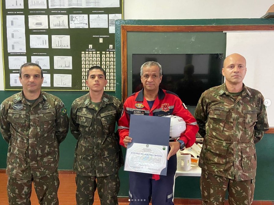Ao final da ministração foi feita uma homenagem ao instrutor com a entrega de certificação feita pelos chefes de Instrução do TG. Os bombeiros voluntários agradecer pelo convite e ressaltaram a satisfação em contribuir junto ao Exército Brasileiro.
