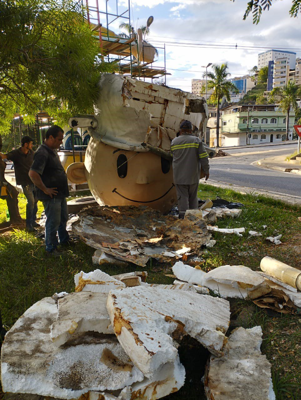 Flávio Rodrigues, que é um dos restauradores, explica o motivo da retirada da cabeça, para que os trabalhos possam ser realizados no solo. Durante a retirada, o material estava bastante deteriorado e a área da panela ficou bastante danificada. “Por se tratar da parte principal do personagem, que fica no alto, precisamos trabalhar com mais cuidado, detalhes. Era necessário mesmo trabalhar com ela em baixo. Estávamos ainda com expectativa de saber dos problemas que ela tinha, por se tratar de uma peça feita com diversos retalhos de isopor colados, isso pode ter ajudado a acontecer isso. Bom seria trabalhar com o bloco maciço. Mas, o detalhe é que o tempo fez com que isso umedecesse por dentro e ocorresse esse transtorno. Agora é muito trabalho pela frente”.