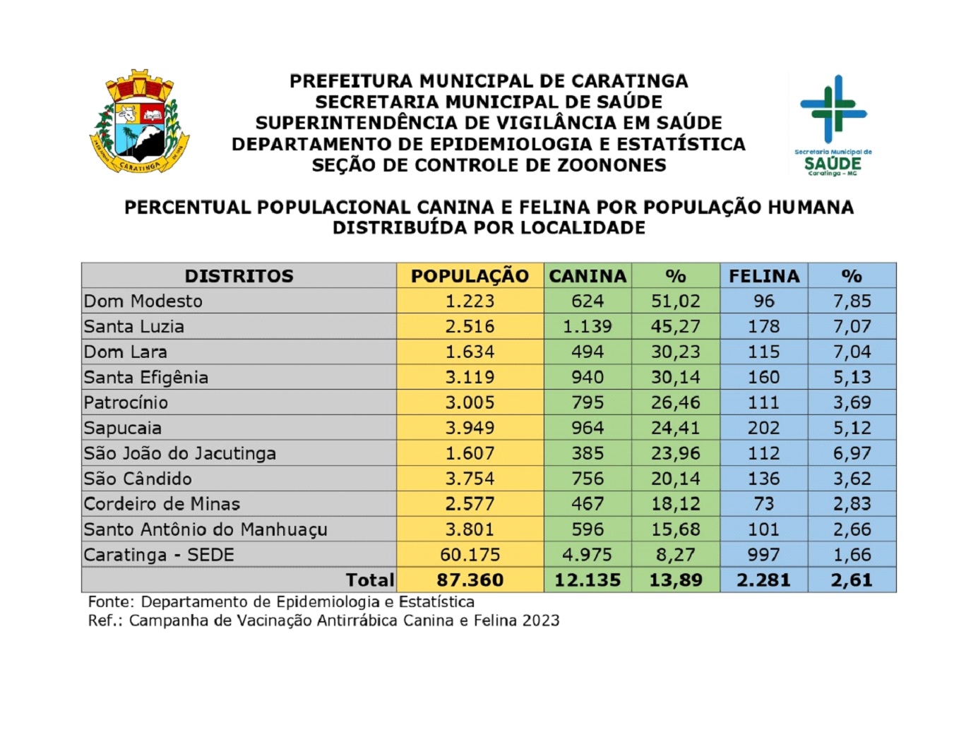 Na sede de Caratinga foram contabilizados 4.975 cães e 997 gatos. A Unidade Móvel de Castração, conhecida como Castramóvel, em seu segundo ciclo de atividades, percorreu todos os distritos do município e atendeu a sede entre um distrito e outro, o que é fundamental no controle da reprodução animal na cidade.