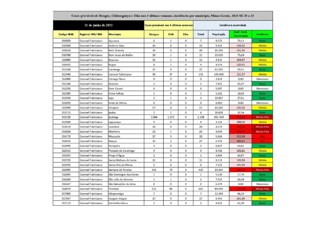 Na região, alguns municípios ainda apresentam incidência média como Inhapim, Piedade de Caratinga, Santa Bárbara do Leste, Santa Rita de Minas e Vargem Alegre.