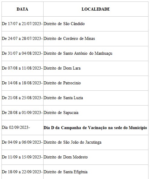 No dia 2 de setembro, sábado, acontece o Dia D da Campanha na sede do município. Serão estruturados 30 pontos de vacinação, já conhecidos pela população, onde as pessoas poderão levar seus animais para receberem a vacina.