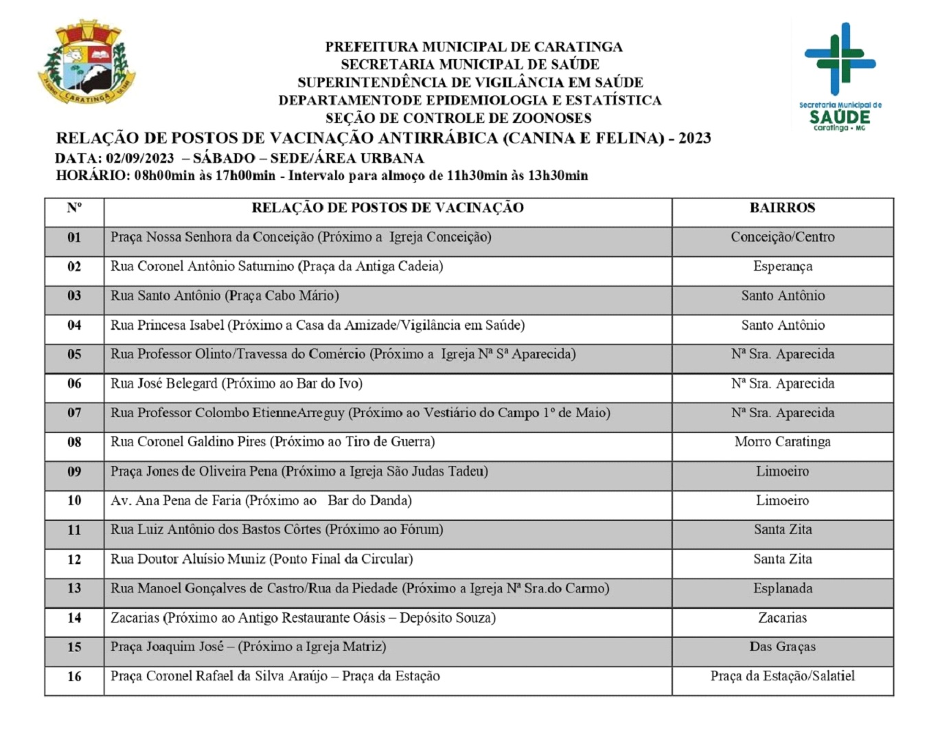 Na sede de Caratinga, para atendimento aos bairros, o Dia acontecerá no sábado, 2 de setembro, no horário das 8h às 17h, com intervalo para almoço das 11h30 às 13h30. São 23 postos de vacinação, confira cada localidade no quadro.