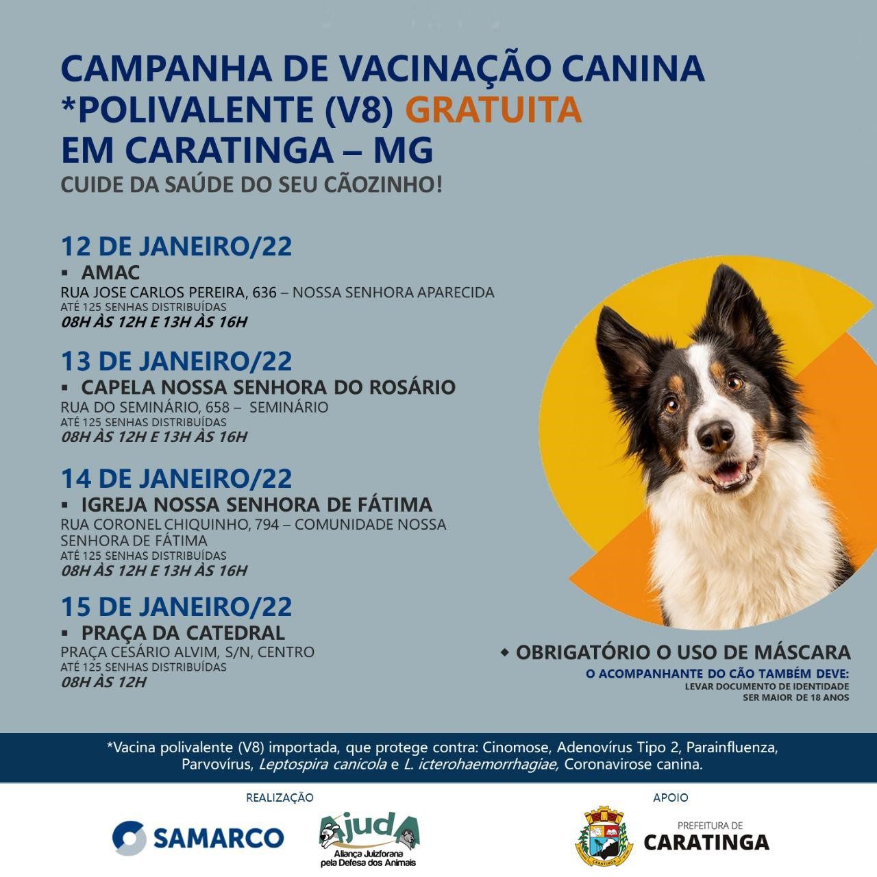 CARATINGA – Foi prorrogada até o próximo sábado (15) a Campanha de Vacinação Canina. A ação é uma iniciativa da Samarco e a ONG Ajuda (Aliança Juizforana pela Defesa dos Animais), com o apoio da prefeitura de Caratinga. A ação de imunização tem o objetivo de combater algumas das principais doenças que acometem a população canina, sendo elas: Cinomose, Hepatite, Adenovirose, Parainfluenza, Parvovirose, Coronavirose e Leptospirose.