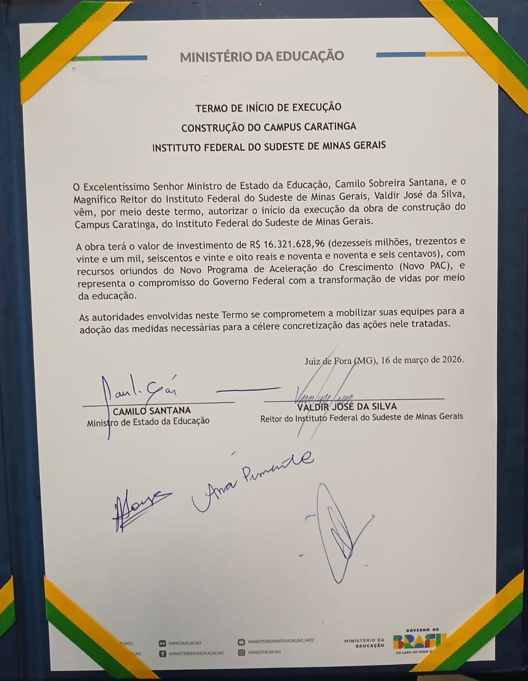 A assinatura ocorreu durante visita ao Colégio de Dirigentes da Reitoria da instituição, na cidade de Juiz de Fora, com a presença do ministro da Educação, Camilo Santana; do reitor do Instituto Federal do Sudeste de Minas Gerais, Valdir José da Silva; e do secretário da Secretaria de Educação Profissional e Tecnológica, Marcelo Bregagnoli. Também participou do ato Rui Gonçalves de Souza, responsável por acompanhar o processo de implantação da unidade no município.