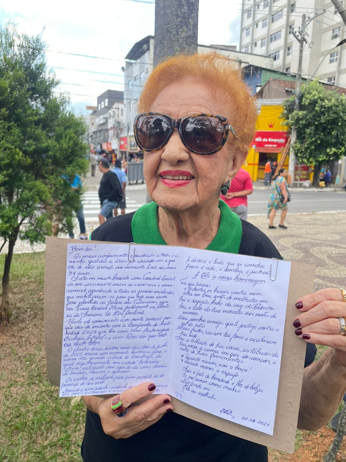 A abertura aconteceu na segunda (5), com o plantio de uma muda de pau-brasil na Praça Cesário Alvim, em uma ação emocionante promovida pelo Movimento Amigos de Caratinga (MAC). A cerimônia contou com a presença de Elzi Amorim, presidente emérita do grupo, que celebrou um antigo sonho: “Muita honra, muita emoção, que eu realizo o sonho de quando professora primária na década de 70… Eu com 94 anos, esperar isso desde tanto tempo. Quem tem esperança no coração, quem tem fé em Deus consegue os sonhos. Estou muito feliz. Inclusive uma madeira de lei, no ano da ecologia. Tudo muito abençoado, muito na hora certa”.
