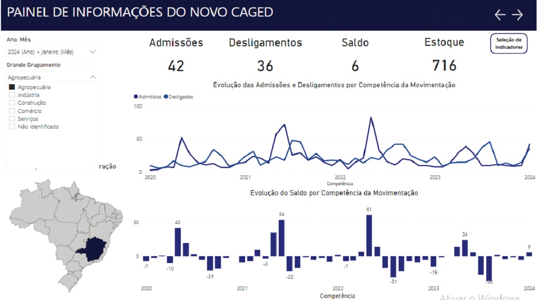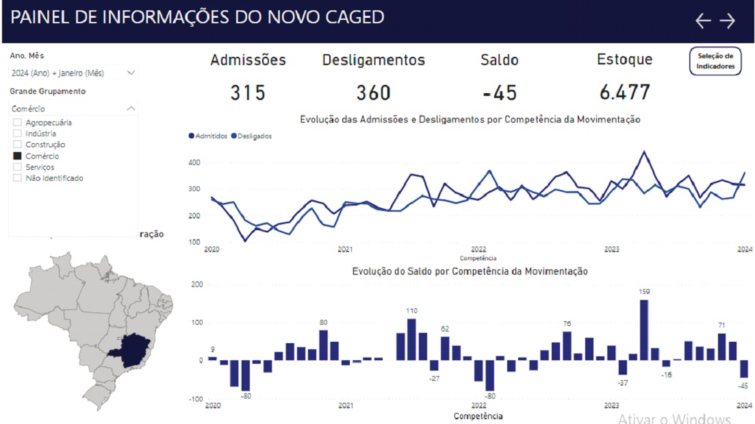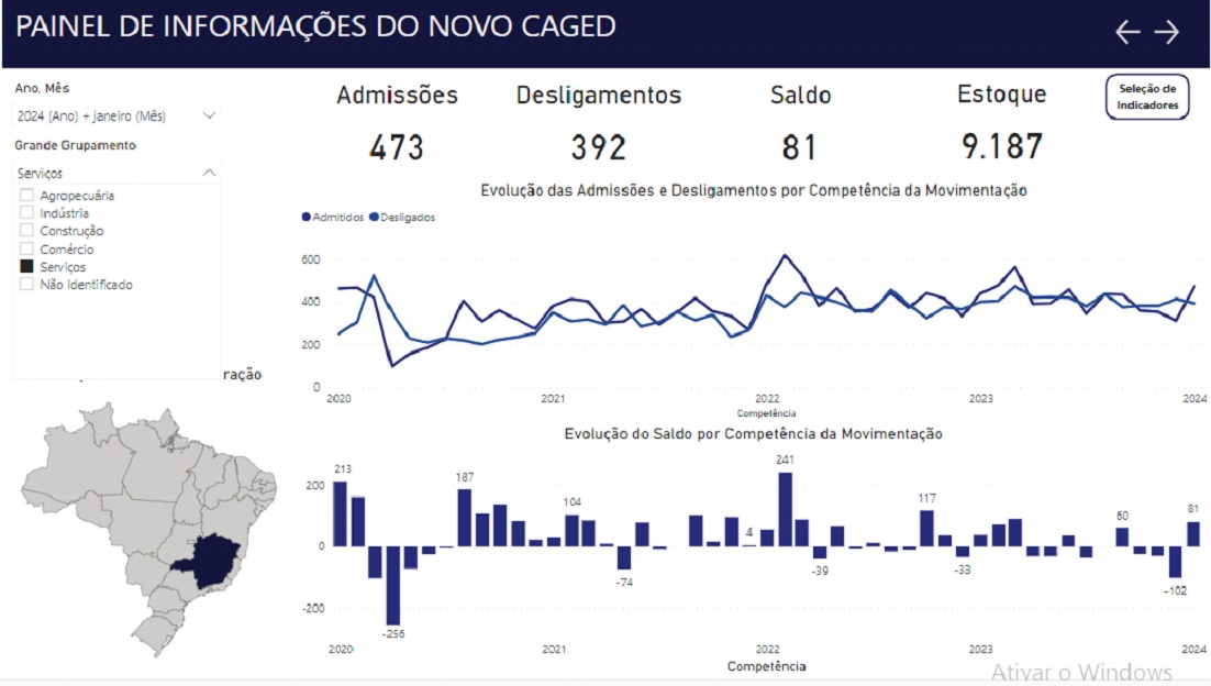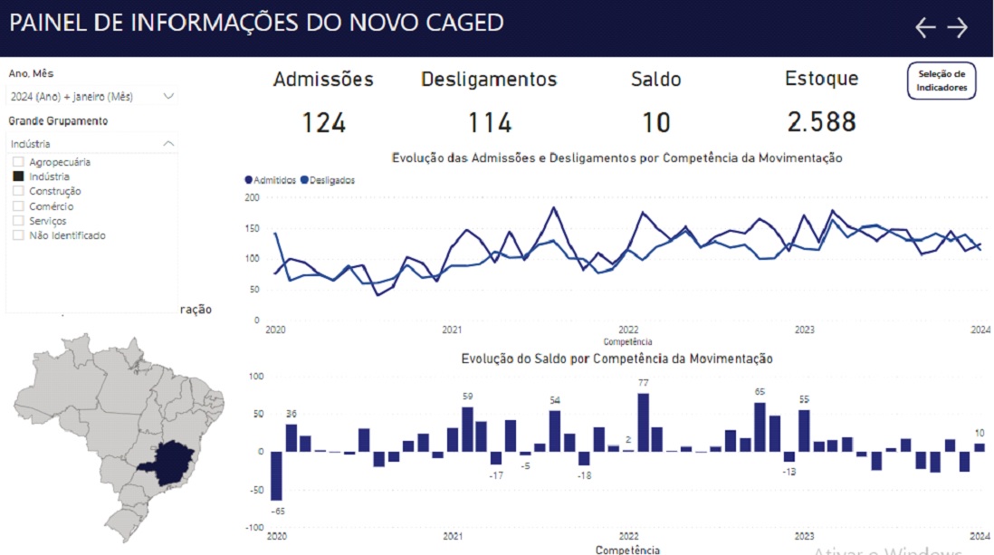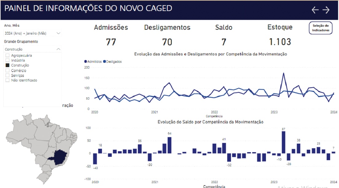 Entre fevereiro de 2023 e janeiro de 2024, o Novo Caged anotou saldo positivo de 1.564.257 empregos, decorrente de 23.422.419 admissões e de 21.858.162 desligamentos.