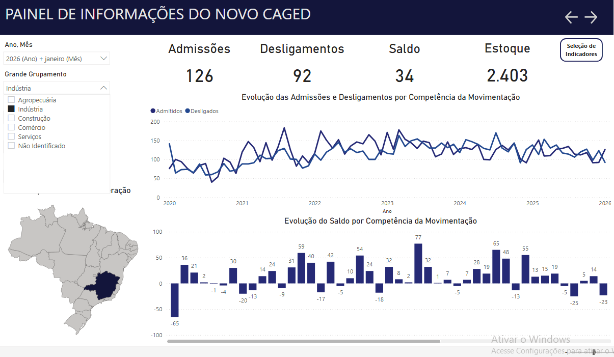 No cenário nacional, o Brasil apresentou saldo positivo de 112.334 novos empregos com carteira assinada em janeiro, resultado de 2.208.030 admissões e 2.095.696 demissões, conforme dados do Caged.