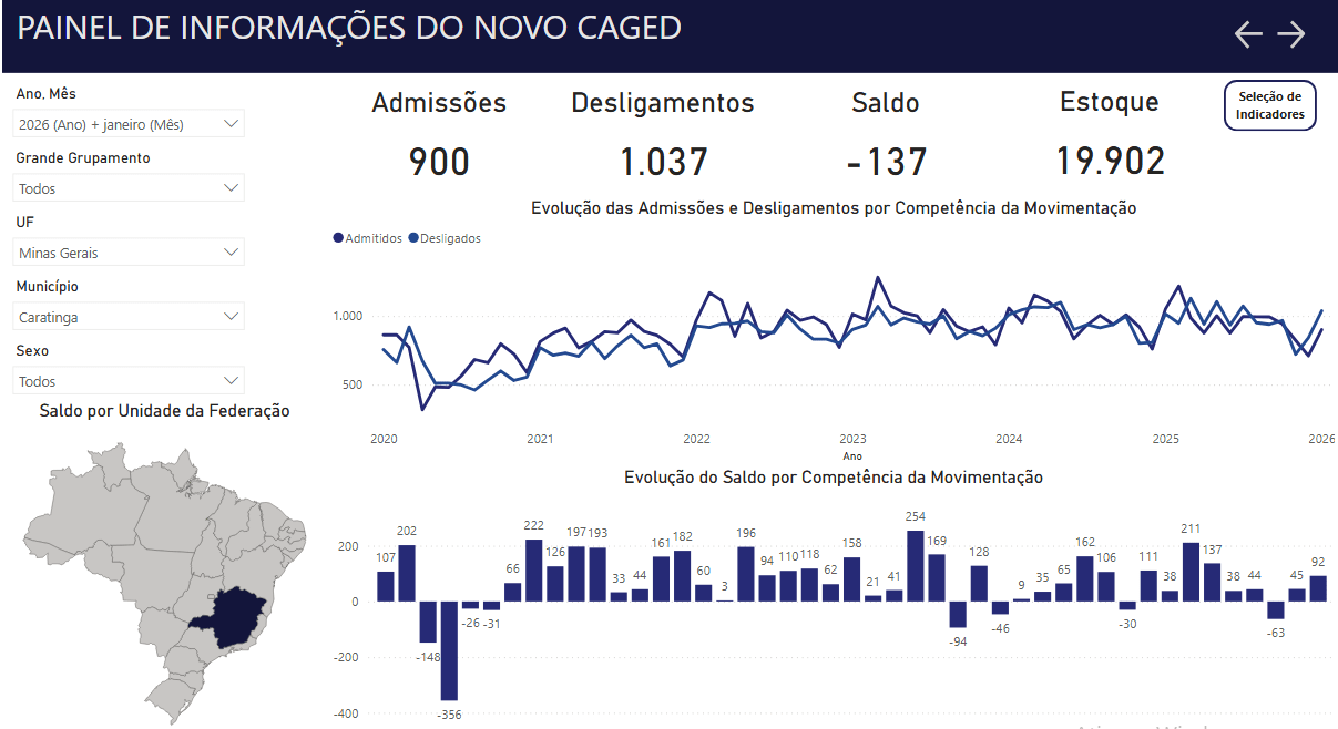 CARATINGA – O município de Caratinga começou o ano de 2026 com saldo negativo na geração de empregos formais. Dados do Novo Cadastro Geral de Empregados e Desempregados (Caged), divulgados pelo Ministério do Trabalho e Emprego na última terça-feira (3), mostram que janeiro terminou com 137 vagas a menos com carteira assinada na cidade.