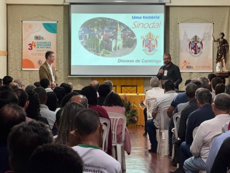 Padre Marlone Pedrosa, mestre em Teologia Pastoral pela e vigário do Santuário Senhor Bom Jesus fez uma apresentação histórica da Diocese aos participantes. “Estamos na 34ª Assembleia e nosso povo é sempre muito receptivo e animado nessas assembleias. Isso é muito gratificante pra nós. E tivemos oportunidade aqui de fazer uma releitura do nosso caminhar pastoral desde o Vaticano II até hoje. É bom lembrarmos que nós que aqui estamos hoje como padres e leigos de Caratinga, não estamos inventando a igreja em Caratinga, ela tem todo um percurso, uma história bonita que merece ser rememorada, contada e ser fonte de inspiração para que possamos então, de forma muito consciente, cristã e comprometida com o caminhar dessa diocese, propor diretrizes, metas e objetivos para que possamos então fazer esse plano de pastoral, que tem que ser não só a cara da nossa Diocese, mas, sobretudo, a cara da igreja no Brasil, na América Latina, atendendo as perspectivas e necessidades do mundo atual que são muitas”.