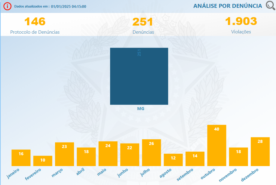 CARATINGA – Caratinga encerrou o ano de 2024 com um cenário preocupante no que diz respeito à violência contra grupos vulneráveis. De acordo informações atualizadas de janeiro a dezembro pelo Painel de Dados da Ouvidoria Nacional de Direitos Humanos, o município registrou 251 denúncias que resultaram em 1.903 violações, evidenciando um quadro alarmante de agressões e abusos.