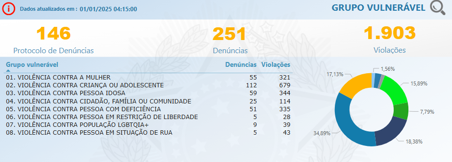 A categoria mais afetada foi a de crianças e adolescentes, com 112 denúncias e 679 violações registradas. Esse dado reflete a vulnerabilidade dos menores dentro do ambiente em que vivem. Idosos e mulheres também aparecem com números significativos: 59 denúncias para pessoas idosas (344 violações) e 55 denúncias de violência contra mulheres (321 violações).