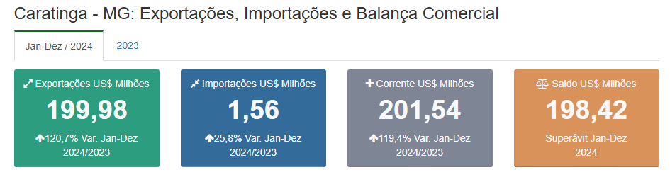 A corrente de comércio de Caratinga, soma das exportações e importações, alcançou a marca de US$ 201,54 milhões em 2024. O saldo comercial apresentou um superávit expressivo de US$ 198,42 milhões no período.