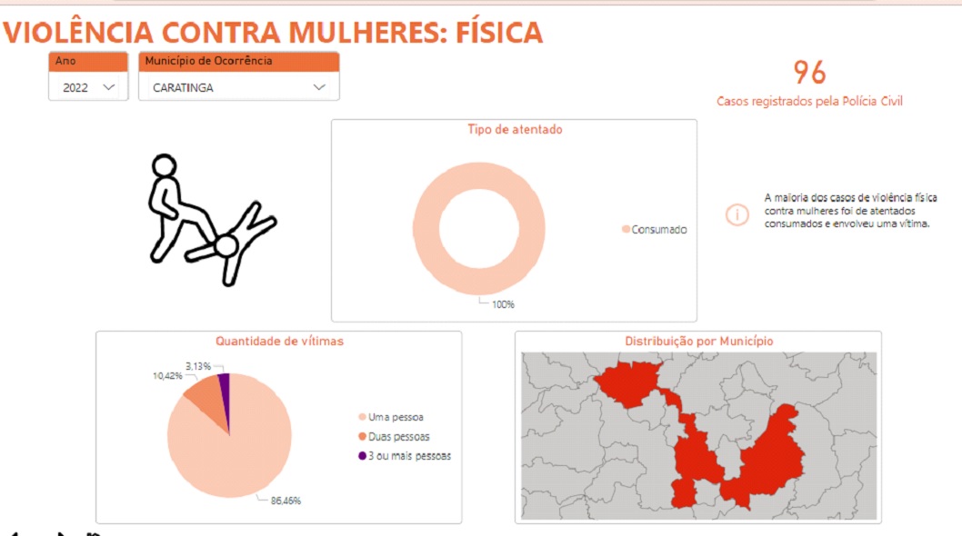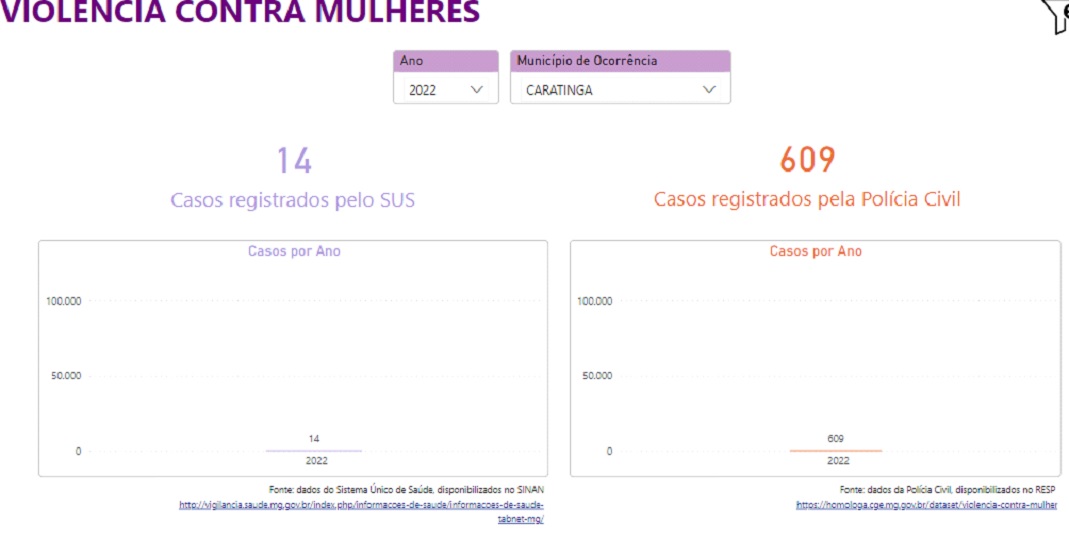 CARATINGA – O painel “Olhares sobre a Violência Contra as Mulheres”, da Secretaria de Estado de Saúde (SES-MG) apresenta os dados de saúde retirados do Sistema de Informação de Agravos de Notificação (Sinan) e de registros estatísticos da Polícia Civil.