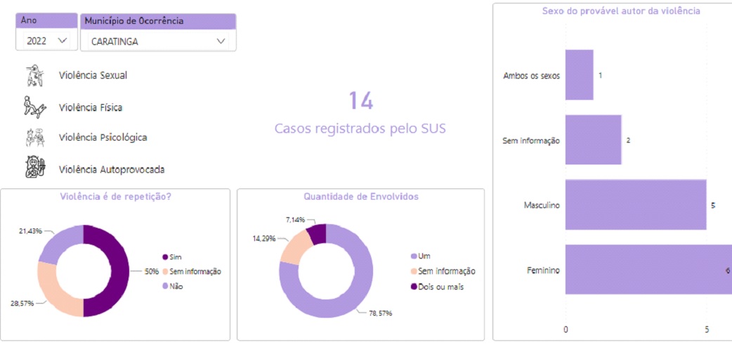 Conforme o site, no ano de 2022, Caratinga teve 14 casos registrados pelo SUS e 609 casos registrados pela Polícia Civil. Dos casos registrados pelo SUS, a maioria foi em residência, envolvendo vítimas com idade entre 20 e 39 anos.