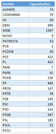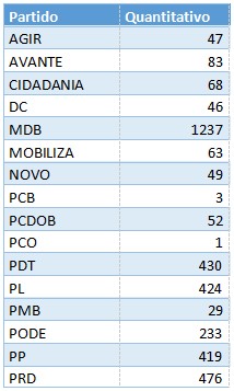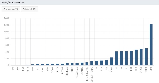 O MDB segue sendo o partido com o maior número de filiados: 1.237, o que corresponde a 20,94%.