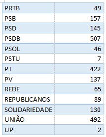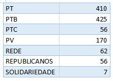 Em 2024, o DEM, que se fundiu com o Partido Social Liberal (PSL) deu lugar ao União Brasil (UNIÃO), que contabiliza 492 filiados. Já o Patriota com a fusão com o PTB se tornou Partido Renovação Democrática (PRD), que registrou 476 filiações partidárias.