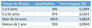 A maioria tem mais de 10 anos de filiação e é do sexo masculino. Casados e tendo como principais públicos por escolaridade, Ensino Fundamental Incompleto (25,68 %), Ensino Médio Completo (22,55 %), Superior Completo (19,72 %) e Lê e Escreve (12,66 %).