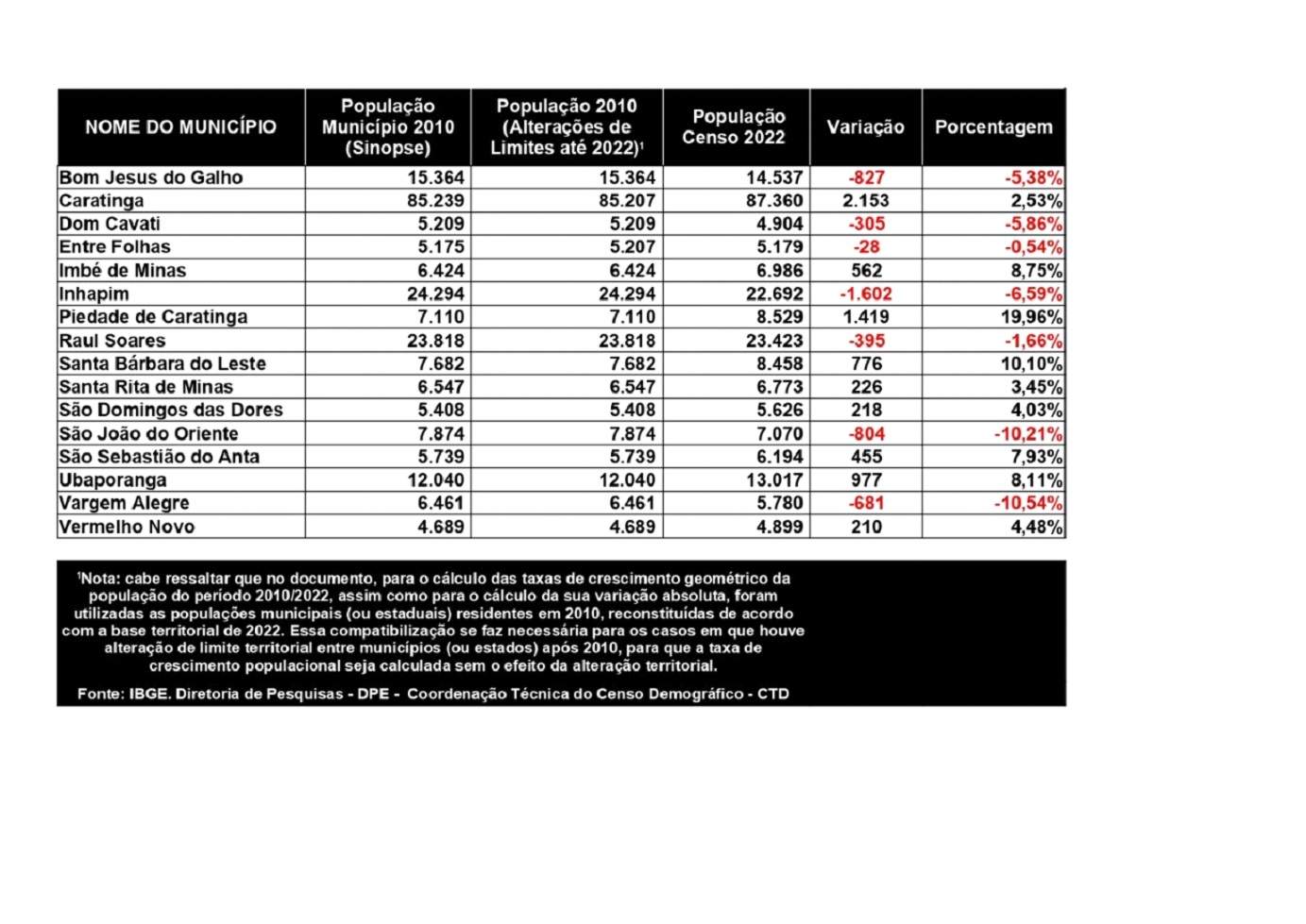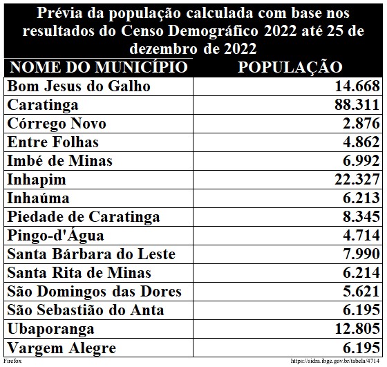 Dentre os municípios da região, o maior incremento da população foi observado em Piedade de Caratinga, sendo de quase 20%, saltando de uma população de 7.110 habitantes em 2010 para 8.529 habitantes em 2022. Já em relação à queda, São João do Oriente e Vargem Alegre registraram as principais quedas.