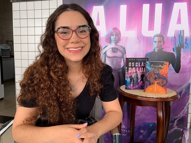 “Os clãs da lua” é o meu lançamento. É uma ficção científica, que é uma releitura do livro de Êxodo, só que no espaço, onde em vez dos israelitas serem escravizados no Egito, nós temos a humanidade escravizada na Lua. Ele foi o lançamento na Bienal de São Paulo, que aconteceu em setembro, o nono livro mais vendido do estande da Thomas Nelson e também uma obra que eu estive com ela na Flip, que é a festa literária de Paraty. Fui convidada pela Publish News, que é um jornal só focado no mercado literário, para estar em uma das mesas na programação oficial deles e também mostrando um pouco das minhas obras. Então, esse aqui é o lançamento que já esteve aí nesses eventos e é uma aventura, é um livro único. E o meu primeiro livro, que é uma fantasia cristã, “A escolha do verão”, que conta a história de um garoto que nasceu numa vila onde só tinha uma estação, o verão. Lá era sempre sol, sempre calor por gerações, até que um dia o sol desaparece e o inverno rigoroso chega tomando conta de tudo. E aí, pra salvar a sua família, o Beor tem que partir numa jornada pra encontrar a estação desaparecida, pra encontrar o verão e trazer ele de volta. E esse é o primeiro livro de uma série de quatro livros.