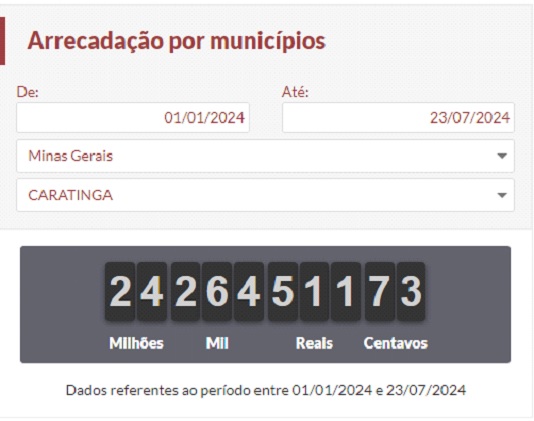 Em Caratinga, conforme os dados para o período 1° de janeiro a 23 de julho de 2024, às 14h30 desta terça-feira (23), o valor arrecadado já ultrapassava R$ 24 milhões. Em valores exatos o total é de R$ 24.264.511,73 (vinte e quatro milhões e duzentos e sessenta e quatro mil e quinhentos e onze reais e setenta e três centavos). No mesmo período, em 2023, foram arrecadados R$ 20.431.309 (vinte milhões e quatrocentos e trinta e um mil e trezentos e nove reais).