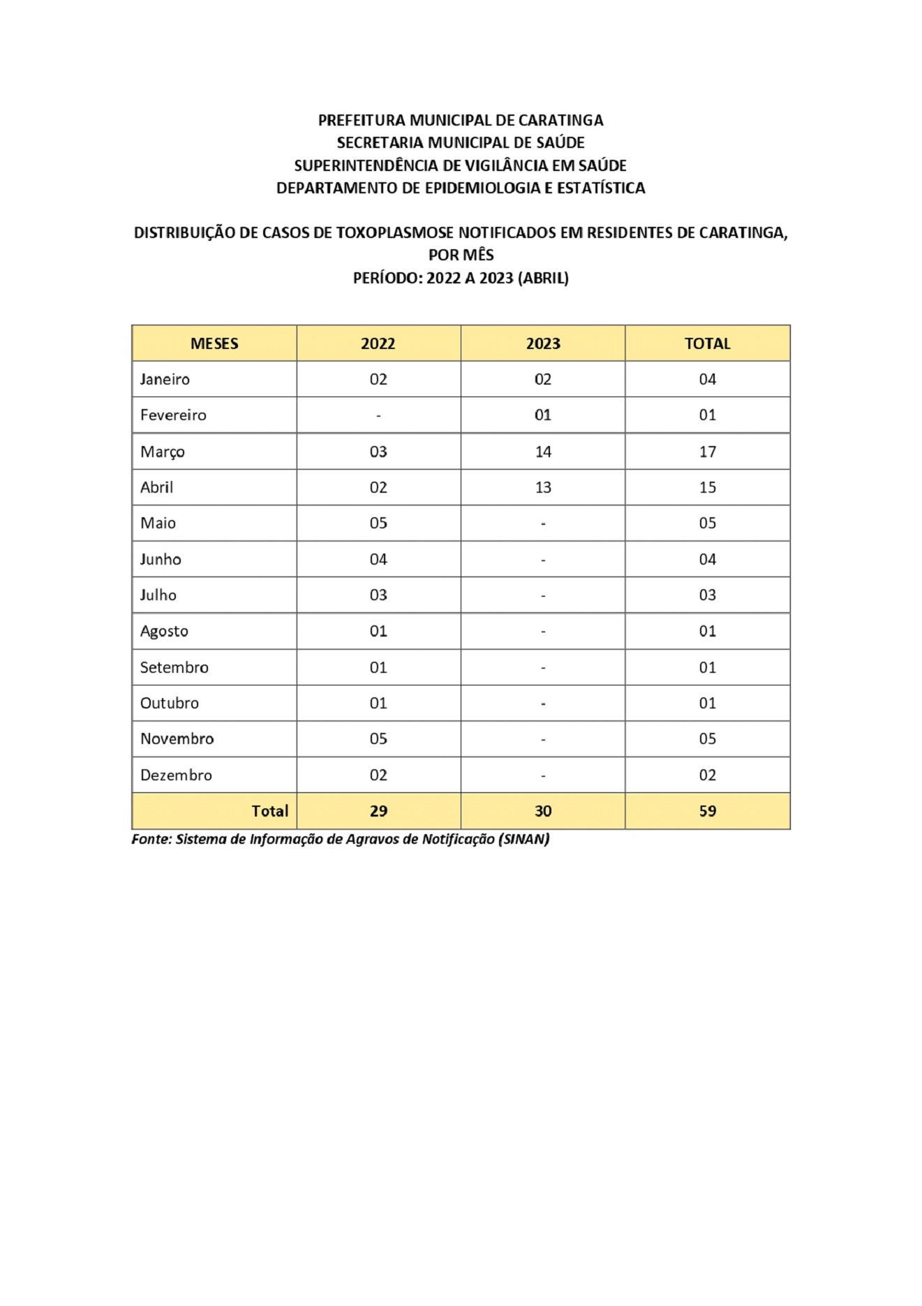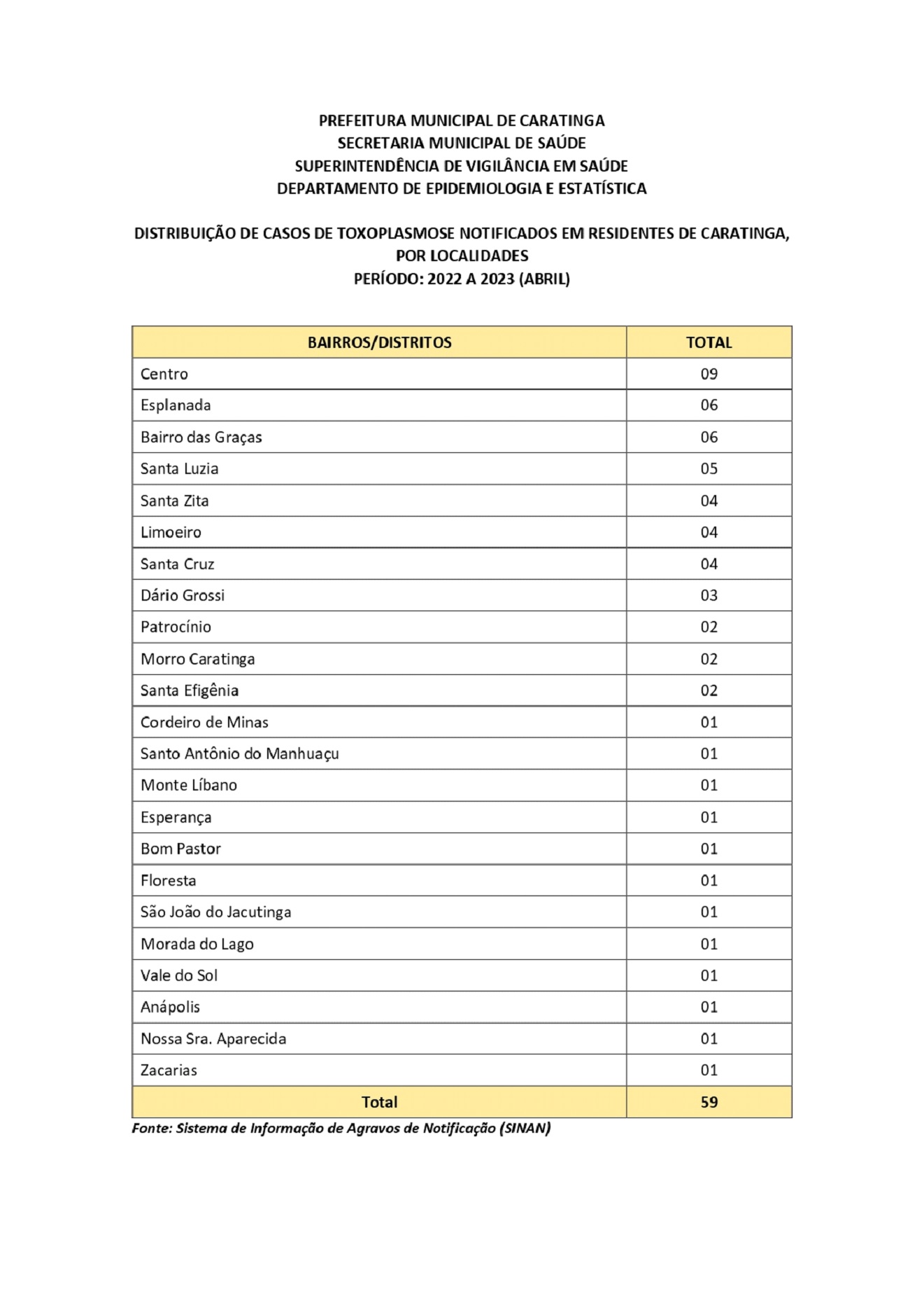 Em virtude do aumento de casos de toxoplasmose no município de Caratinga nos últimos dois anos, atendidos em consultórios médicos e notificados pelos laboratórios particulares após busca ativa, a Superintendência de Vigilância em Saúde alertou sobe a obrigatoriedade da notificação em todas as unidades básicas de saúde, hospitais, laboratórios e consultórios médicos.