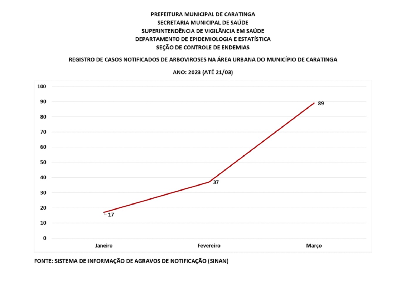 Em Caratinga, o número de casos notificados de arboviroses na área urbana (Dengue, Zika e Chikungunya) saltou de 17 em janeiro para 89 em março (até dia 21).