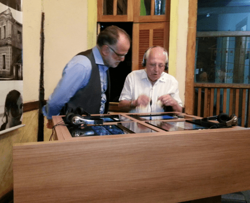 Cláudio Leitão e o jornalista Carlos Alberto Fontainha observam o ‘Púlpito Interativo’